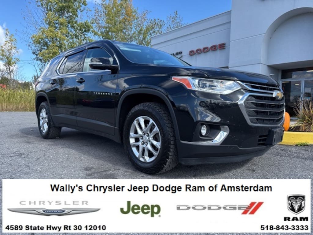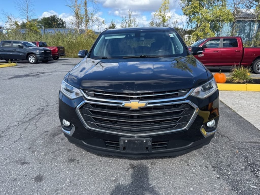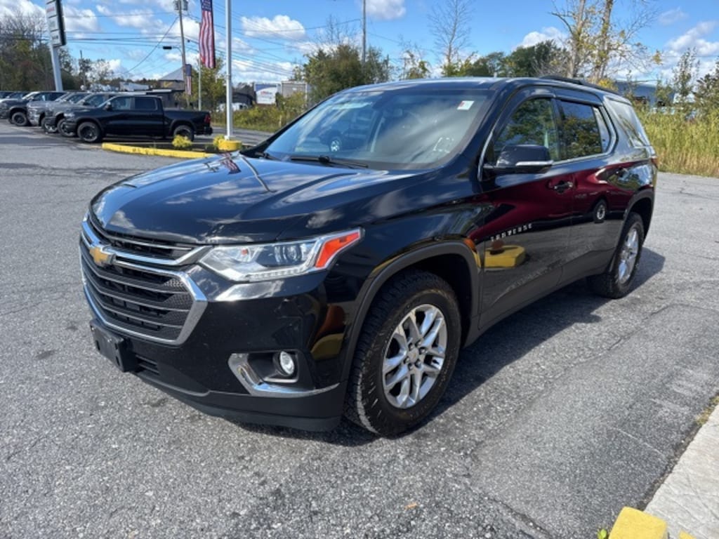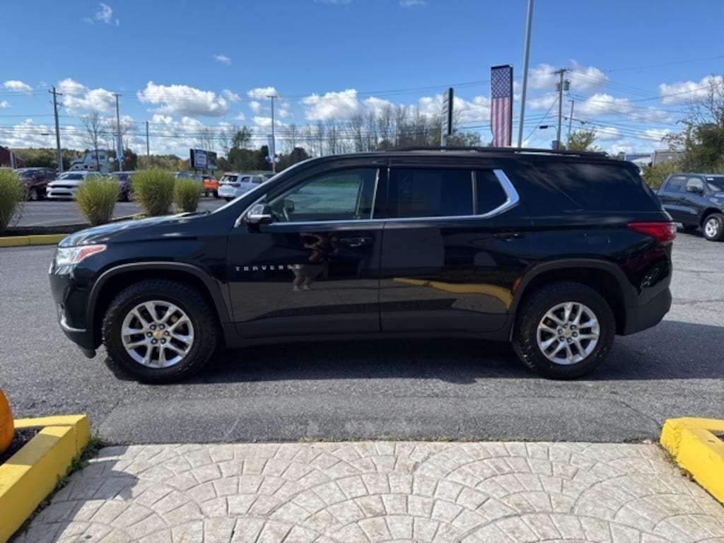 Clean CARFAX. Cloth w/1LT Traverse LT Cloth w/1LT, 4D Sport Utility, 3.6L V6 SIDI VVT, 9-Speed Automatic, AWD, Mosaic Black Metallic, Jet Black Cloth, 3rd row seats: split-bench, 4-Wheel Disc Brakes, 6 Speakers, 7-Passenger Seating (2-2-3 Seating Configuration), ABS brakes, Air Conditioning, Alloy wheels, AM/FM radio: SiriusXM, Apple CarPlay/Android Auto, Automatic temperature control, Brake assist, Bumpers: body-color, Compass, Delay-off headlights, Driver door bin, Driver vanity mirror, Electronic Stability Control, Four wheel independent suspension, Front Bucket Seats, Front Center Armrest, Front dual zone A/C, Front fog lights, Front License Plate Bracket Mounting Package, Front reading lights, Fully automatic headlights, Garage door transmitter, Heated door mirrors, Heated front seats, Heavy-Duty Cooling System, High-Intensity Discharge Headlights, Illuminated entry, Outside temperature display, Overhead console, Panic alarm, Passenger door bin, Passenger vanity mirror, Power door mirrors, Power driver seat, Power Liftgate, Power steering, Power windows, Preferred Equipment Group 1LT, Premium Cloth Seat Trim, Radio data system, Radio: Chevrolet Infotainment AM/FM w/8" Screen, Rear air conditioning, Rear reading lights, Rear window defroster, Rear window wiper, Remote keyless entry, Roof rack: rails only, Security system, SiriusXM Radio, Speed control, Speed-sensing steering, Spoiler, Steering wheel mounted audio controls, Tachometer, Telescoping steering wheel, Tilt steering wheel, Traction control, Trailering Equipment, Trip computer, Turn signal indicator mirrors, Variably intermittent wipers, Voltmeter, Wheels: 18" Bright Silver Painted Aluminum.